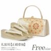 シルバー地に金糸や銀糸で華紋などが施された、礼装姿に相応しい華やかさを持つデザインです。 裏側は、落ち着いた色合いで上品な雰囲気。 輝きを放つ留め金もお洒落なデザインで、お着物姿をさらに華やかに彩ります。 草履台は高級感のあるゴールドの台で、かかとの高さは5.5cmと程よいヒール高。 花緒にはバッグと同じ生地を使い統一感をプラスし、美しい足元を演出します。 クッション加工が施されているので、履き心地の良い逸品です。 裏側には滑りにくいゴム底を施しているので、草履に不慣れな方でも足を痛めにくく歩きやすい作りになっております。 バッグは一本手で持ちやすく、袱紗やお財布、スマートフォンなどがしっかりと入る大きさ。 ご婚礼などのおめでたいお席の黒留袖や色留袖、訪問着などの礼装のお着物に幅広くお使いいただけます。
