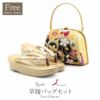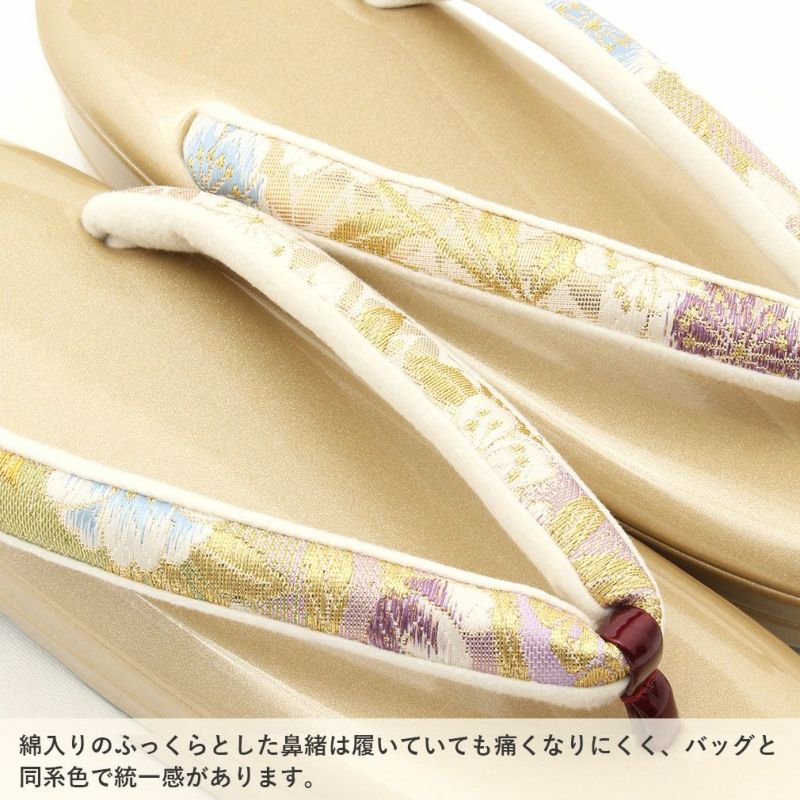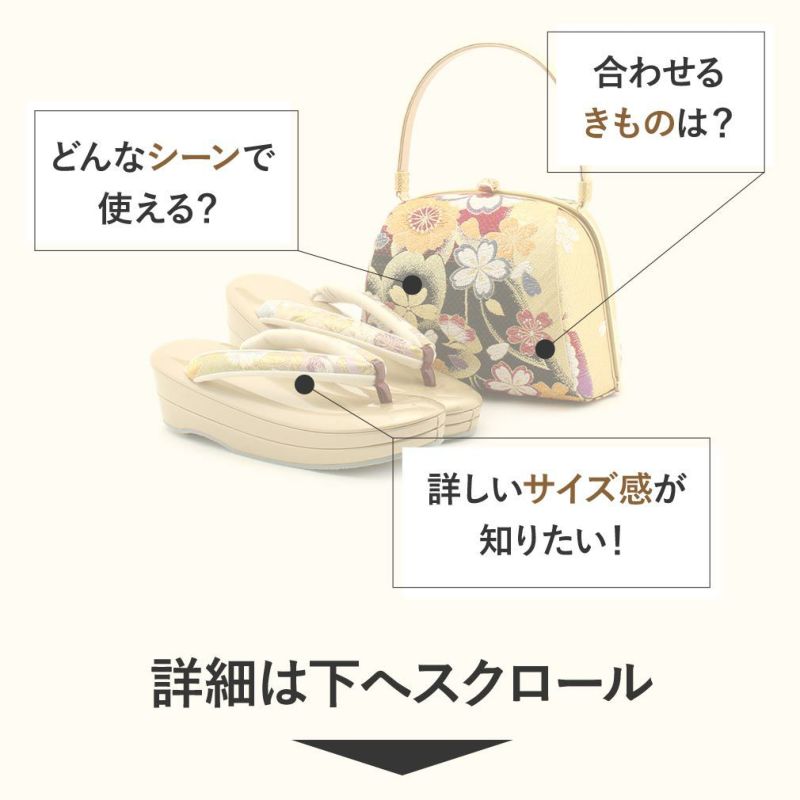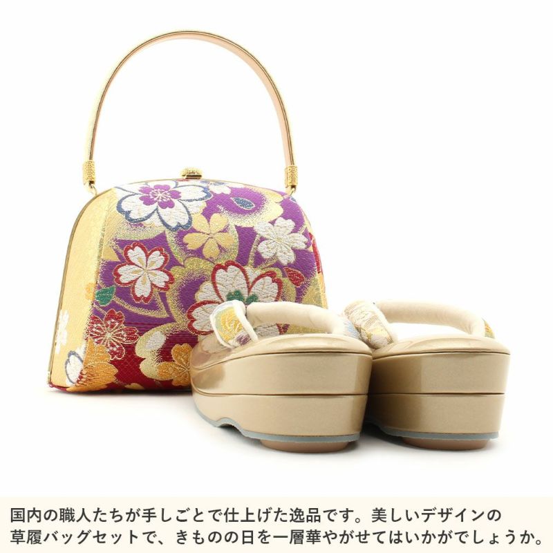 正絹の帯地を使用した振袖用草履バッグセットです。 煌びやかな帯地に描かれた花紋と桜が振袖スタイルをよりいっそう華やかにしてくれます。 織り込まれた金糸が角度によって煌びやかな輝きを放ち、お着物姿をさらに豪華に演出。 バッグと同じデザインの草履の花緒が統一感をプラスしています。 バッグは一本手で持ちやすく、お財布やスマートフォンなどが入る程良い大きさ。 バッグの開口部分は装飾を施した金色の飾り金具が煌めく華やかな装い。 口が大きく開くため、中身が一目でわかり、出し入れも便利です。 成人式の振袖を始め、卒業式の袴や結婚式のお呼ばれなど華やかな着姿にご利用いただけます。 お着物に合わせて美しいコーディネートをお楽しみください。