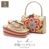 正絹帯地を使用した振袖用厚底草履バッグセットをご用意致しました。 バッグ生地と花緒には、金糸、色糸をふんだんに使用した大きな華紋が織り込まれており、振袖スタイルに相応しい豪華で華やかさのあるデザインです。 バッグと同じデザインの草履の花緒が統一感をプラスし、お着物姿をより一層華やかに。 艶やかで光沢のあるエナメルの草履台はゴールドとレッドの4枚芯ハイヒール。柔らかなクッション加工が施された履きやすさ抜群の逸品です。 かかとの高さは約7.5cmのヒール高で、小柄なお嬢様はもちろん、身長の高いお嬢様の着姿をも美しく魅せ、歩きやすく足への負担を軽減します。 バッグの容量は、お財布やスマホなどが入る程良い大きさ。開きも大きく 小物の出し入れがスムーズに出来ます。 他の人とは違うオシャレにこだわりたい、そんなお洒落女子におススメする、ワンランク上の草履バッグセット。 成人式の振袖を始め、卒業式の袴や結婚式のお呼ばれなど華やかな着姿にご利用いただけます。 着姿をスタイルよく魅せてくれる美しい草履や豪華な花紋のバッグを、大切なハレの日にぜひご活用下さい。