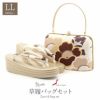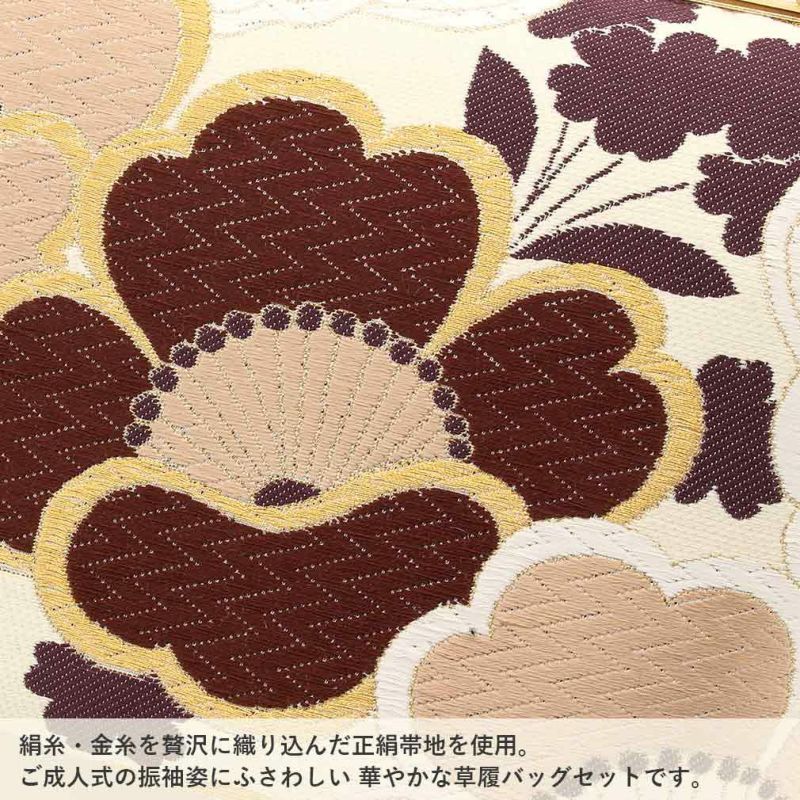 正絹帯地を使用した振袖用厚底草履バッグセットをご用意致しました。 バッグ生地と花緒には、絹糸や金糸をふんだんに使用した花紋が織り込まれており、振袖スタイルに相応しい豪華で華やかさのあるデザインです。 バッグと同じデザインの草履の花緒が統一感をプラスし、お着物姿をより一層華やかに。 艶やかで光沢のあるエナメルの草履台は3枚芯。柔らかなクッション加工が施された履きやすさ抜群の逸品です。 かかとの高さは約6.0cmのヒール高で、小柄なお嬢様はもちろん身長の高いお嬢様の着姿をも美しく魅せ、歩きやすく足への負担を軽減します。 バッグの容量は、お財布やスマホなどが入る程良い大きさ。開きも大きく 小物の出し入れがスムーズに出来ます。 他の人とは違うオシャレにこだわりたい、そんなお洒落女子におススメする、ワンランク上の草履バッグセット。 成人式の振袖を始め、卒業式の袴や結婚式のお呼ばれなど華やかな着姿にご利用いただけます。 着姿をスタイルよく魅せてくれる美しい草履や豪華な花紋のバッグを、大切なハレの日にぜひご活用下さい。