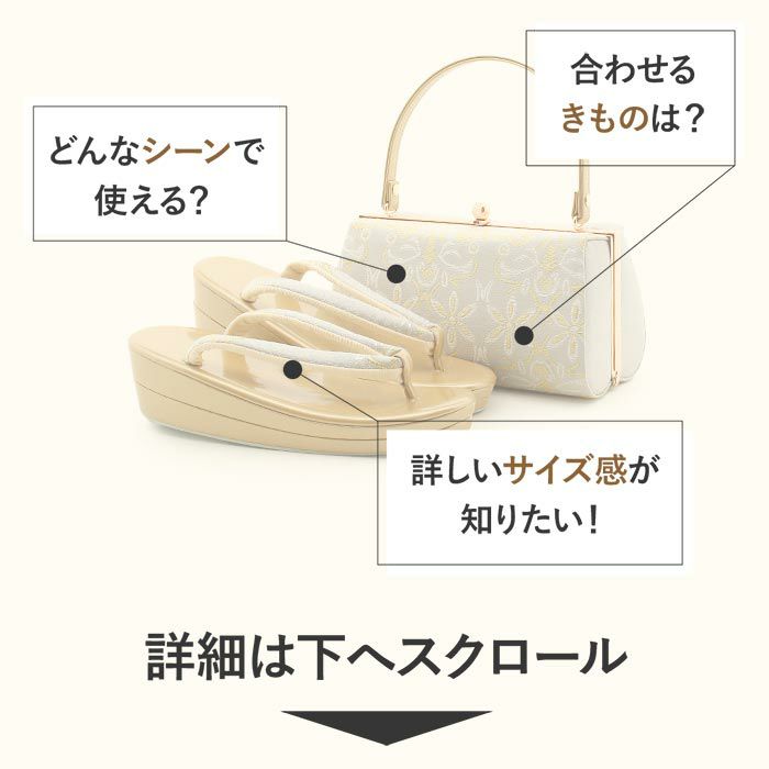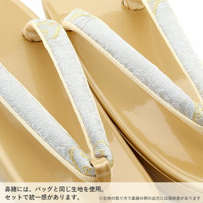 鼻緒にはバッグと同じ生地が使われており、上品な輝きとコーディネート全体の統一感を演出します。
