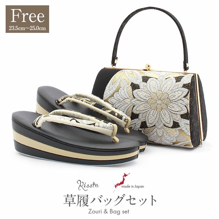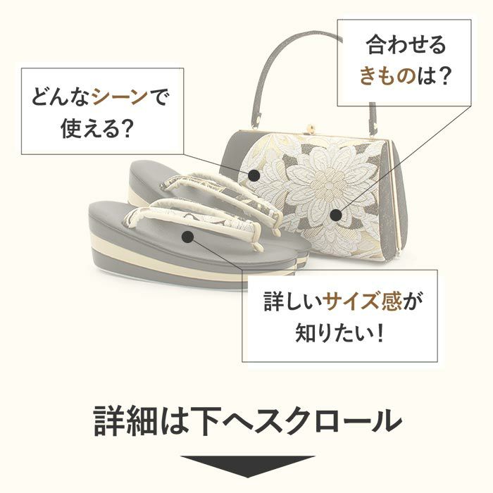 成人式や結婚式での振袖や卒業袴といった、華やかなおきものの装いに合わせていただける日本製の振袖用草履バッグセットです。 手仕事で仕上げることによって痛くない草履・美しいバッグを実現した、大切な日のための和装アイテムです。 繊細で上質な織感を楽しんでいただける、振袖用帯地を使用したお洒落なバッグ。 金糸やラメ糸で織り込まれた柄ゆきが煌めき、ポイントになっています。 バッグの開口部分は金色の口金が煌めく華やかな雰囲気。 一本手で持ちやすいバッグは、小ぶりなお財布やスマートフォン、ハンカチや口紅などの手放せない小物が入る容量。 でも見た目が大きすぎることはなく、すっきりとしたサイズ感なのが嬉しいポイントです。 マットな質感の草履は人気の厚底タイプ。高さのある草履は小柄なお嬢様はもちろん、身長の高いお嬢様の着姿をも美しく魅せます。 鼻緒にはバッグと同じ生地が使われており、上品な輝きとコーディネート全体の統一感を演出します。 足裏の当たる部分はなだらかな曲線のため、前に滑りすぎずきもの初心者の方も履きやすくおすすめの草履です。 お母様やお姉様の振袖を受け継いで、草履バッグセットを新調したコーディネートにするお嬢様も多くいらっしゃいます。 レンタル店や写真館などでは貸し出しの草履バッグセットもありますが、レンタルではなかなか出回らない繊細なお作りやお洒落なデザインの草履バッグは振袖コーデの中でもぱっと目を引く存在になるでしょう。 華やかな装いを楽しみたい日のおともに、ぜひお手に取っていただきたい草履バッグセットです。