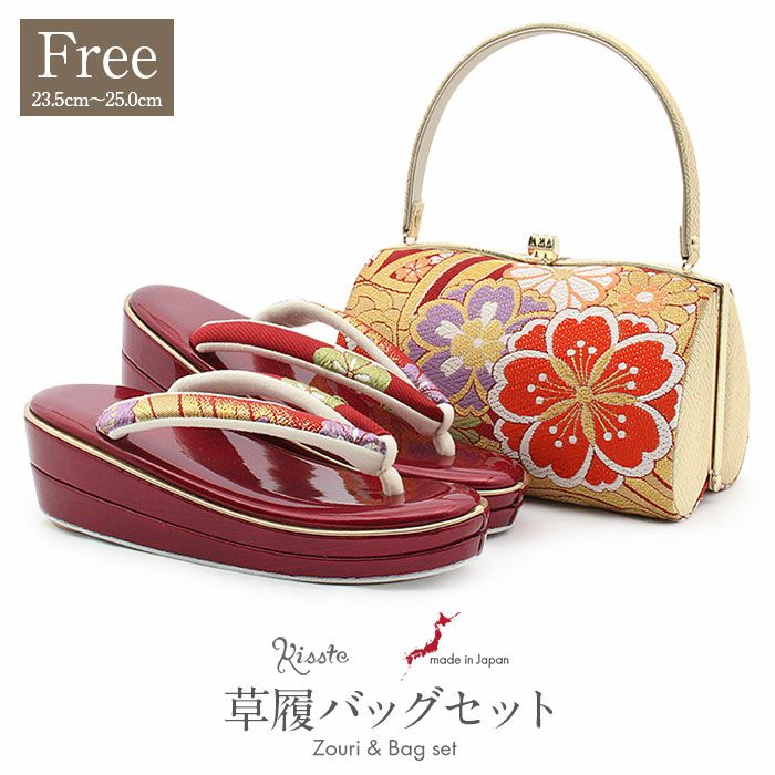 バッグ・花緒:ゴールド、レッド、ホワイト、ライトグリーン、ライトパープル 草履台:レッド