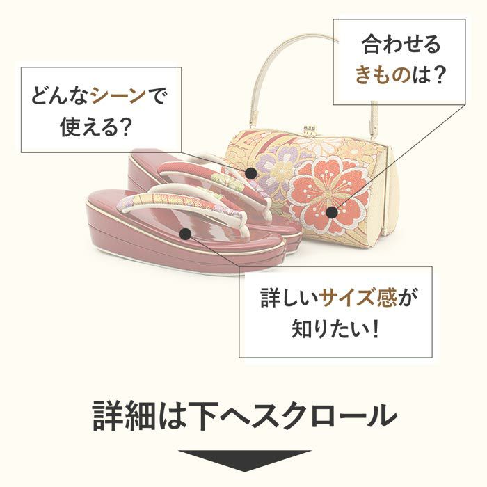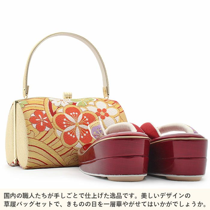 成人式や結婚式での振袖や卒業袴といった、華やかなおきものの装いに合わせていただける日本製の振袖用草履バッグセットです。 手仕事で仕上げることによって痛くない草履・美しいバッグを実現した、大切な日のための和装アイテムです。 金糸を贅沢に織り込んだ西陣織帯地を使用した、ご成人式の振袖姿にふさわしい華やかな草履バッグセットです。 梅や桜などの吉祥花が織り込まれた、特別な日にふさわしい豪華なデザインです。 バッグの開口部分は繊細な装飾を施した口金が煌めく格調高い雰囲気に。 一本手で持ちやすいバッグは、小ぶりなお財布やスマートフォン、ハンカチや口紅などの手放せない小物が入る容量。 でも見た目が大きすぎることはなく、すっきりとしたサイズ感なのが嬉しいポイントです。 バッグと同じデザインの草履の花緒が統一感をプラスし、お着物姿をより一層華やかに。 織物風のプリントが施されたナメルの草履台は、側面に入る金ラインと合わせて更なるお洒落さを演出しています。 かかとの高さが約6cmとちょうど良い高さです。 足裏の当たる部分はなだらかな曲線のため、前に滑りすぎず、きもの初心者の方も履きやすくおすすめの草履です。 お母様やお姉様の振袖を受け継いで、草履バッグセットを新調したコーディネートにするお嬢様も多くいらっしゃいます。 レンタル店や写真館などでは貸し出しの草履バッグセットもありますが、レンタルではなかなか出回らない繊細なお作りやお洒落なデザインの草履バッグは振袖コーデの中でもぱっと目を引く存在になるでしょう。 華やかな装いを楽しみたい日のおともに、ぜひお手に取っていただきたい草履バッグセットです。