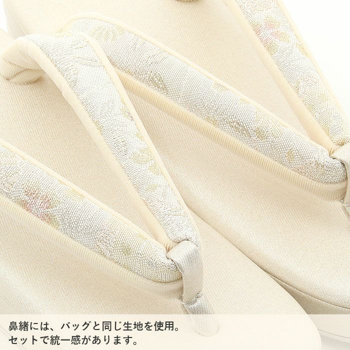 バッグ・花緒:シルバーにホワイト、明るいゴールドなど 草履台:アイボリー