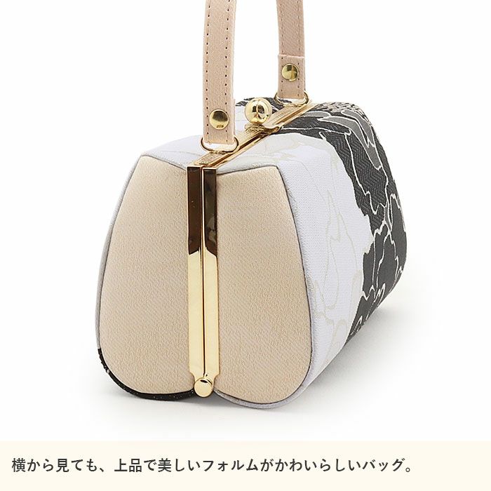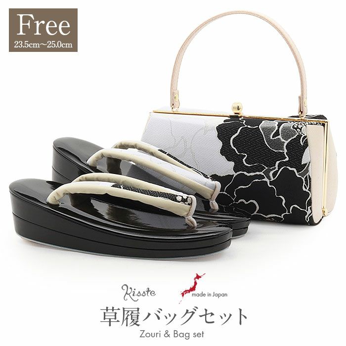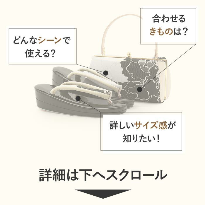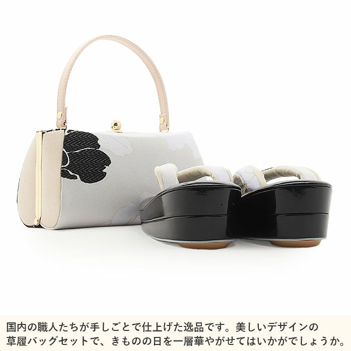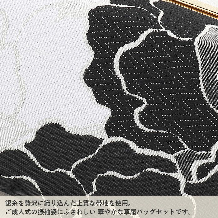 成人式や結婚式での振袖や卒業袴に合わせていただける草履バッグセットです。 わずかな機会でも新品の草履バッグセットですがすがしくお出かけしていただけるよう、お手頃価格でご用意いたしました。 上品なホワイトを基調に、シックなブラックとシルバーで丁寧に織り出された牡丹文様が優雅に広がります。 銀糸の輝きが意匠を際立たせ、特別な日の装いを華やかに引き立てます。 ■バッグはコンパクトながら、小ぶりなお財布やスマートフォン・ハンカチや口紅などの手放せない手荷物が入る収納力があり、お祝いの席にもぴったりな洗練されたデザイン。 口金タイプで開閉しやすく、実用性にも優れています。 ■草履は艶やかなブラックの草履台にバッグと共布の鼻緒を添え、上品で統一感のあるコーディネートを演出。 2枚芯の程よい高さで安定感もあり、クッション性のある柔らかな履き心地で長時間のご着用も安心です。 華やかな装いを楽しみたい日のおともに、ぜひお手に取っていただきたい草履バッグセットです。