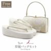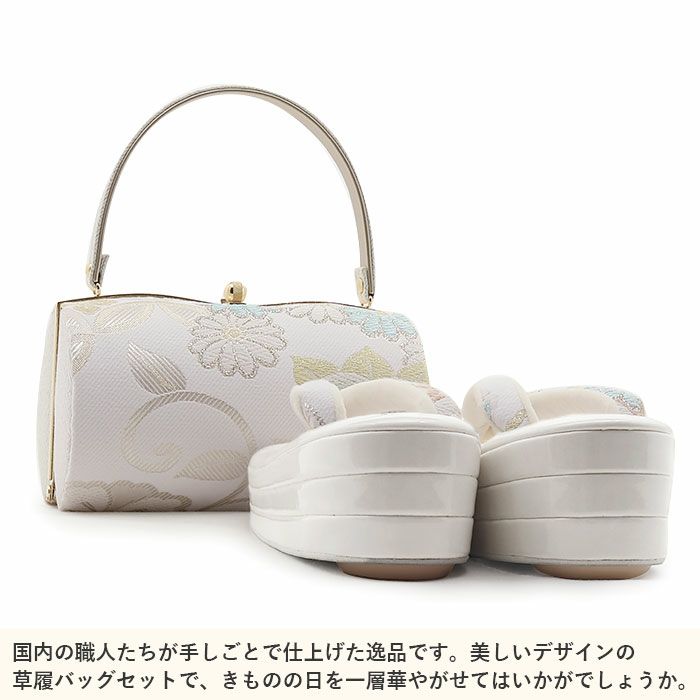 成人式 草履バックセット 振袖 草履バッグセット 草履 バッグ フリー L ホワイト 万寿菊 七宝 橘 西陣織 正絹帯地 エナメル 3枚芯 日本製
