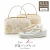 着物雑誌でもお馴染みの「華三彩」ブランドの草履バッグセットです。 「華三彩」は国内唯一の草履自社生産にこだわるメーカーブランドで、匠の技術が結集され、貴賓の風格漂う最高級草履バッグセットです。 訪問着や留袖などフォーマルな席はもちろん、成人式や結婚式などの振袖姿にもふさわしい、華やかで上品な一揃えです。 金糸・銀糸が煌びやかに輝くバッグと草履の花緒には花唐草柄が織り込まれ、礼装時に相応しい豪華さと上品さのあるデザインです。 バッグと同じデザインの草履の花緒が統一感をプラス。 草履は、職人さんによる手づくりの最高級草履。 かかとの高さは約6.0cmと程良いヒール高で、ソフト加工が施された履きやすさ抜群の逸品です。 バッグの容量は長財布やスマートフォンなど入る程よい大きさ大きさです。 シャンパンゴールドとシルバーの2色をご用意しておりますので、好みに合わせてお選びください。 式場などでは貸し出しの草履バッグセットもありますが、やはりおめでたい席や礼装の場面で真新しい綺麗な草履バッグセットを身につけていることでいい気分で過ごせます。 フォーマルな装いを楽しみたい日のおともに、ぜひお手に取っていただきたい草履バッグセットです。