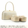 履きものどころ・浅草の名門ブランド「紗織」が手掛ける、礼装用の草履バッグセットです。 結婚式の黒留袖や色留袖、訪問着など、フォーマルな装いにふさわしい上質な一品。 シャンパンゴールドの上品な地色に、「雲取りに菊菱」文様が織り出された、気品あふれるデザインです。 柔らかな光沢と繊細な織り柄が、光の角度によってさりげなく輝き、晴れの日の装いをいっそう華やかに引き立てます。 ■バッグは、小ぶりなお財布やスマートフォン、ハンカチ、口紅など必要な持ち物がしっかり入る実用的なサイズ。 底鋲付きで、畳やテーブルに置いた際もバッグ本体を傷めにくく、安心してお使いいただけます。 ■草履は、熟練の職人が一足ずつ丁寧に仕上げたこだわりのつくり。 クッション性に優れた台を採用し、長時間の歩行でも足への負担を軽減します。 鼻緒にはバッグと同じ生地を使用し、統一感のある上品なコーディネートをお楽しみいただけます。 ■生地には、繊維1本1本に抗菌・防臭効果のある「パールトーン加工(撥水加工)」を施し、美しい風合いや光沢を長く保ちます。 式場などでの貸し出し品もありますが、お祝いの席や礼装の場には、自分だけの新しい草履バッグセットを身に着けることで、より特別な気分に。 晴れやかな一日を気持ちよく過ごしたい方におすすめの、上質なフォーマルアイテムです。