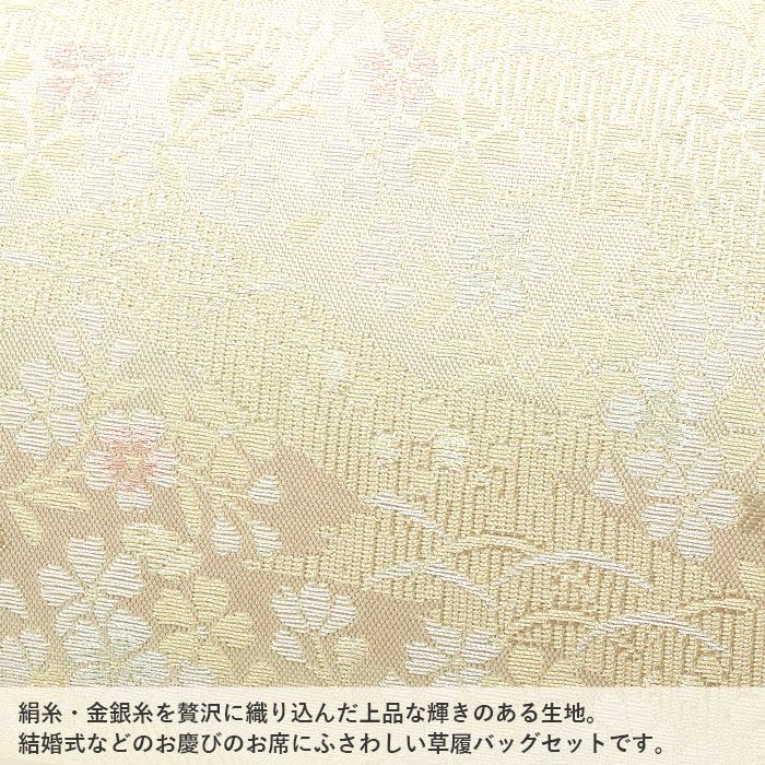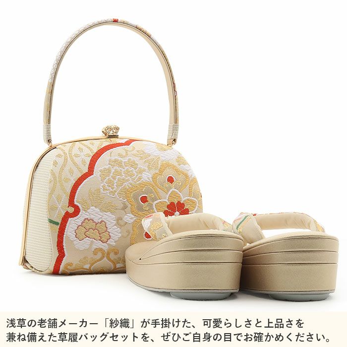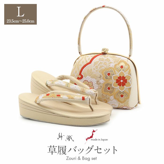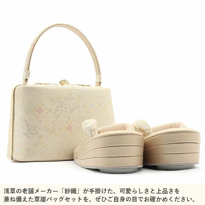 他の画像を見る 痛くない 歩きやすい、初めての方にも安心の履き心地 【アウトレット】 草履バッグセット 留袖用 訪問着用 草履バッグ 世美庵 L シャンパンゴールド アイボリー ピンク 帯地 3枚芯 優花緒 日本製 当店特別価格 ¥ 41,800 税込 (0) カートに入れる お気に入りに登録する