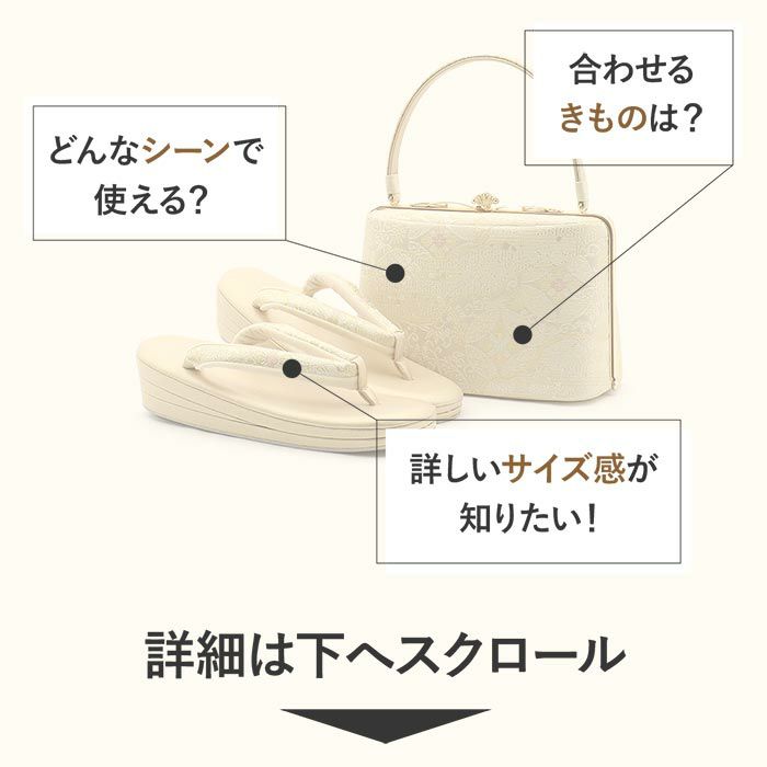 他の画像を見る 痛くなくて歩きやすい、初めての方にも安心の履き心地 留袖用草履バッグセット 訪問着用 草履バッグ 紗織 沙織 LLサイズ 大きい シルバー アイボリー 花七宝 花市松 2の3枚芯 日本製 当店特別価格 ¥ 28,600 税込 (0) カートに入れる お気に入りに登録する