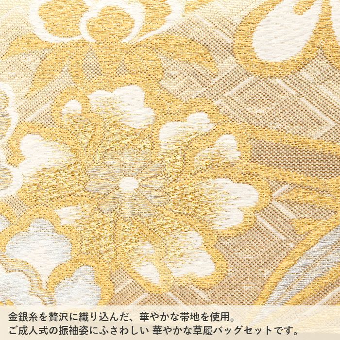 他の画像を見る 歩きやすい「優花緒」仕様。初めての方にも安心の履き心地 草履バッグセット 成人式 振袖用 成人用 世美庵 Lサイズ ゴールド シャンパンゴールド 黒 花紋 帯地 3枚芯 優花緒 日本製 SALE 定価 ¥ 41,800 のところ 当店特別価格 ¥ 37,620 税込 (0) カートに入れる お気に入りに登録する