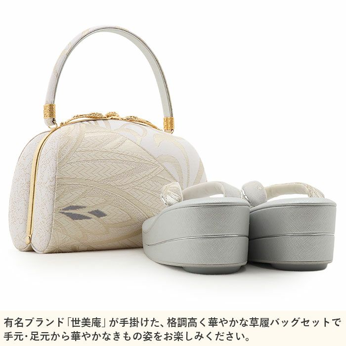 他の画像を見る ≪在庫限り≫ 成人式や結婚式の華やかな振袖に 成人式 草履バックセット 振袖 草履バッグセット 草履 バッグ 世美庵 華三彩 M シルバー アイボリー 灰 唐花模様 帯地 2枚芯 日本製 SALE 定価 ¥ 41,800 のところ 当店特別価格 ¥ 37,620 税込 (0) カートに入れる お気に入りに登録する