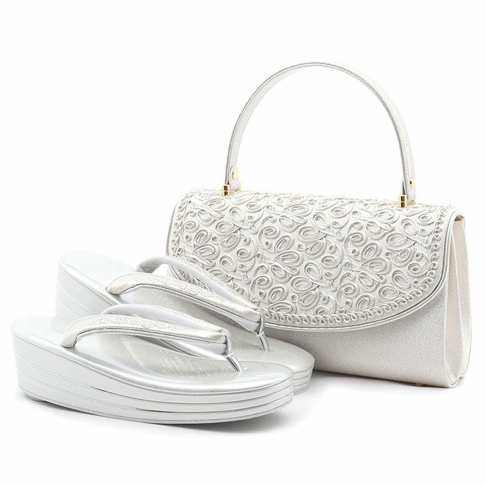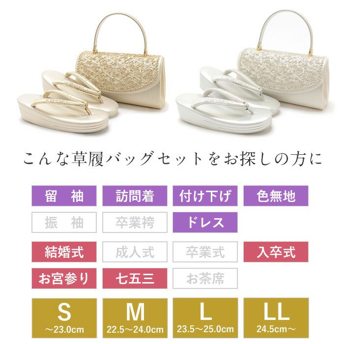 着物雑誌でもお馴染みの「世美庵」ブランドの礼装用草履バッグセットです。 「世美庵」は国内唯一の草履自社生産にこだわるメーカーブランドで、匠の技術が結集され、貴賓の風格漂う最高級草履バッグセットです。 単色色使いのバッグにはコード刺繍が施され、上品な雰囲気のなかにコード刺繍の特徴的な風合いと立体感が際立つ上品で高級感あるデザイン。 留め金部分にも細やかな装飾が施された高級感ある逸品。バッグ容量はお財布やデジタルカメラなどがきっちり入る大きさです。 草履は職人さんによる手づくりの最高級草履。3枚芯にはエレガントなラインが入り、貴賓の風格を演出。ソフトフィット加工で、履きやすさ抜群の逸品です。 かかとの高さは約5.5cmと程よいヒール高で、歩きやすく品のある高さです。 草履に不慣れな方でも足を痛めにくく、美しい着姿を演出します。 結婚式や披露宴の黒留袖や色留袖、訪問着をはじめ、入学式やパーティーなどフォーマルなシーンで幅広くご利用いただける、「世美庵」の高級礼装用草履バッグセットです。