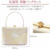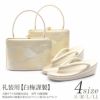 大阪ぞうり協同組合認定の名門、白梅謹製の高級草履バッグセットです。 正絹帯地に秋草の金彩が施され、礼装姿に相応しい華やかさを持つデザインです。 バッグと同じデザインの草履の花緒が統一感をプラス。 職人の手によって丁寧に仕上げられた草履は、艶を抑えた上品なゴールド・シルバー台で、かかとの高さは約6.0cmの高級2枚芯。 柔らかなクッション加工が施されていますので履き心地も抜群の逸品です。 バッグの容量はお財布や携帯電話など、必要なものが入る程よい大きさ。 結婚式や披露宴の黒留袖や色留袖、訪問着をはじめ、入学式やパーティーなどフォーマルなシーンで幅広くご利用いただけます。