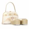 白地に金糸と銀糸で唐花などが施された、礼装姿に相応しい華やかさを持つデザインです。 バッグの留め金もお洒落なデザインで、細部まで職人の技が息づいたこだわりのセットとなっております。 草履台は高級感のあるゴールドの台で、かかとの高さは6cmと程よいヒール高。 花緒にはバッグと同じ生地を使い統一感をプラスし、美しい足元を演出します。 クッション加工が施されているので、履き心地の良い逸品です。 裏側には滑りにくいゴム底を施しているので、草履に不慣れな方でも足を痛めにくく歩きやすい作りになっております。 バッグは一本手で持ちやすく、袱紗やお財布、スマートフォンなどがしっかりと入る大きさ。 ご婚礼などのおめでたいお席の黒留袖や色留袖、訪問着などの礼装のお着物に幅広くお使いいただけます。