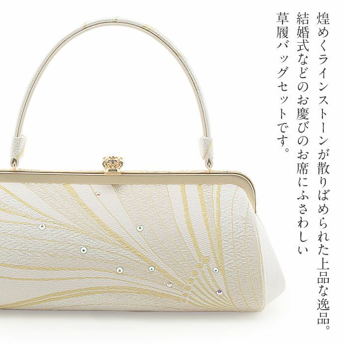 5. 留袖用草履バッグセット 訪問着用 紗織 沙織 Lサイズ 金 クリーム 銀 白 花紋 ラインストーン 西陣織 正絹 帯地 2・3枚芯 日本製