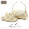 結婚式の黒留袖や色留袖、訪問着などのフォーマルなおきものの装いに合わせていただける草履バッグセットです。 手仕事で仕上げることによって痛くない草履・美しいバッグを実現した、大切な日のための和装アイテムです。 横から見ても上品で美しいフォルムのバッグに、金銀糸や色糸を織り込んだ生地がエレガント。 バッグは、手放せない手荷物が入る容量で、すっきりとしたサイズ感なのが嬉しいポイントです。 底鋲もついて、畳や机に置くときにバッグ本体を擦ってしまうのを防ぐことができます。 草履は日本製で鼻緒も台も足なじみが良く、痛くなりにくい仕様です。 式場などでは貸し出しの草履バッグセットもありますが、やはりおめでたい席や礼装の場面で真新しい綺麗な草履バッグセットを身につけていることでいい気分で過ごせます。 日本の伝統美を現代に伝えるエレガントなデザイン。 フォーマルな装いを楽しみたい日のおともに、ぜひお手に取っていただきたい草履バッグセットです。