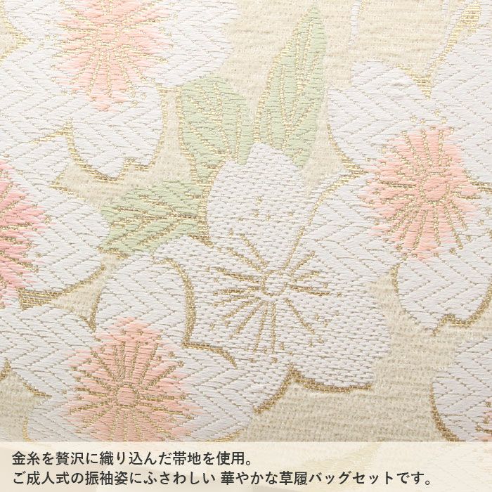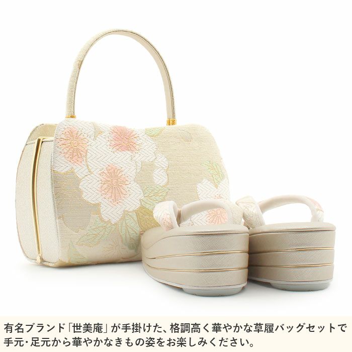 バッグ・花緒:クリーム・ホワイト・ピンクなど 草履台:シャンパンゴールド