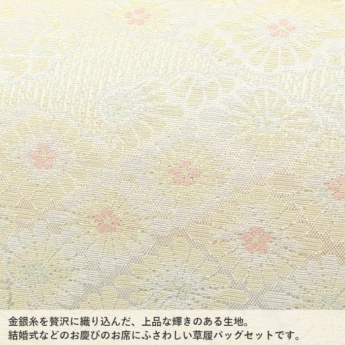 他の画像を見る ≪在庫限り≫ 結婚式の黒留袖 色留袖や訪問着に 草履バッグセット 留袖用 訪問着用 草履バッグ 世美庵 L ゴールド ピンク 白 花菱 花文 帯地 3枚芯 優花緒 日本製 当店特別価格 ¥ 52,800 税込 (0) カートに入れる お気に入りに登録する