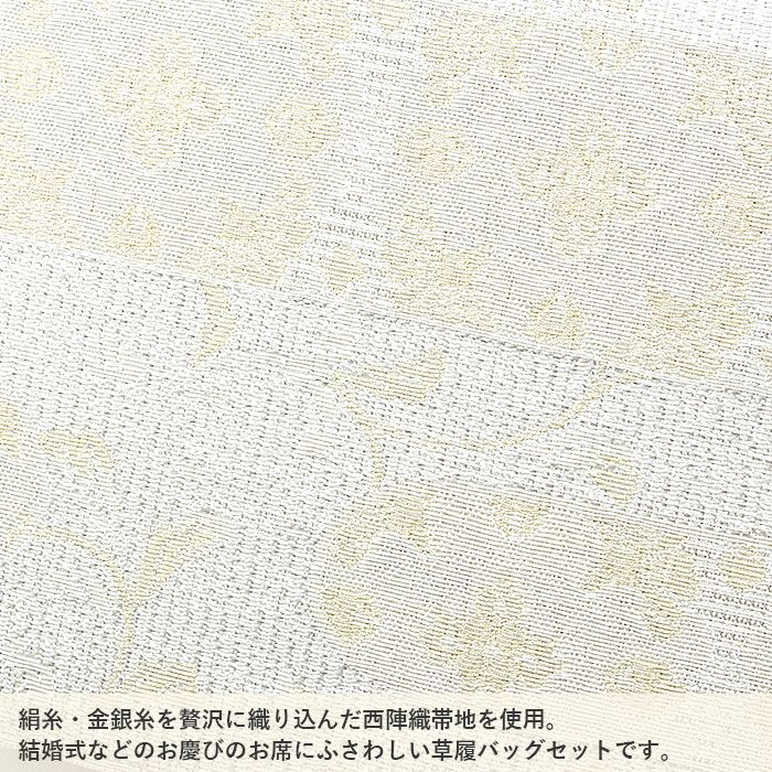 他の画像を見る ≪在庫限り≫ 結婚式の黒留袖 色留袖や訪問着に 草履バッグセット 留袖用 訪問着用 草履バッグ フリー L シルバー ホワイト ベージュゴールド 花丸紋 絹 西陣織 帯地 2枚芯 当店特別価格 ¥ 30,800 税込 (0) カートに入れる お気に入りに登録する