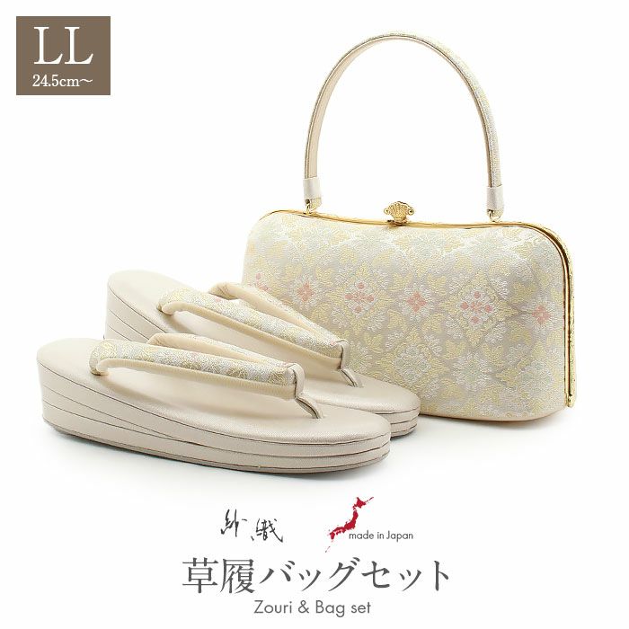 5. 留袖用草履バッグセット 訪問着用 草履バッグ 紗織 沙織 LLサイズ 大きい シルバー アイボリー 花七宝 2の3枚芯 日本製