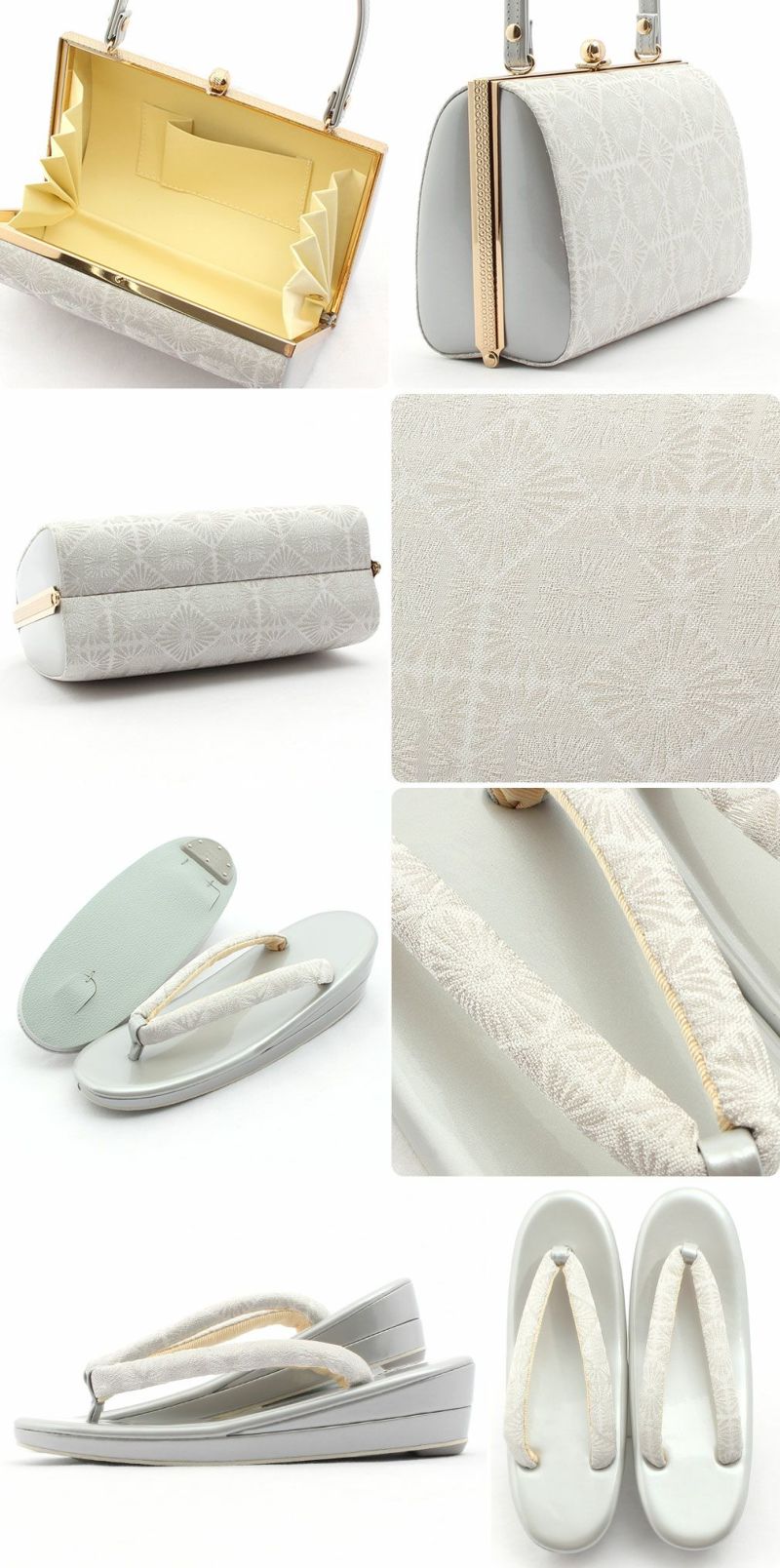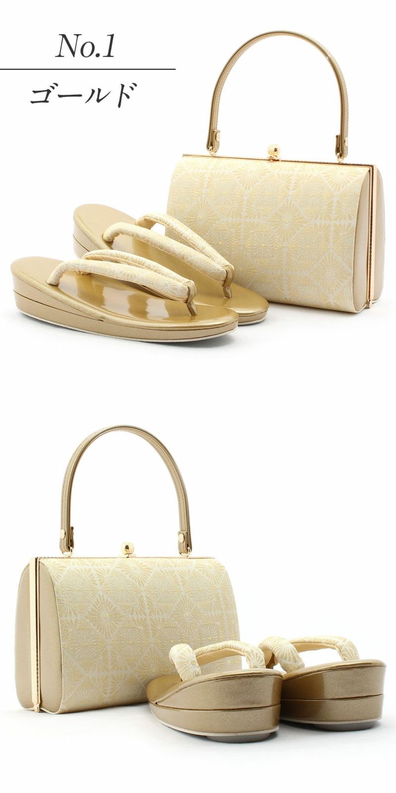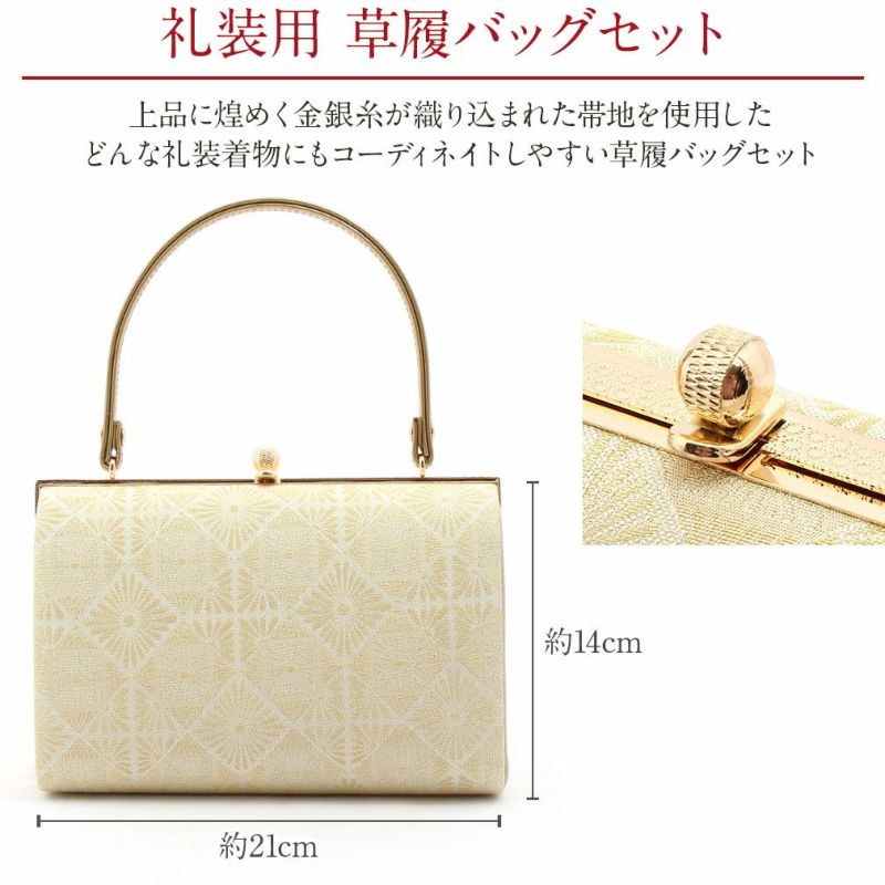 礼装用草履バッグセットをお手頃な価格でご用意いたしました。 上品に煌めく金銀糸が織り込まれた帯地を使用した、どんなフォーマル着物にもコーディネイトしやすいセットとなっております。 色はゴールドとシルバーの2色展開、柄は全部で3柄取り揃えております。 草履のサイズは、22.0~26.0cmまでの小さいサイズから大きいサイズまで対応可能なS・M・L・LLの4サイズ展開。 かかとの高さは5~5.5cm前後と着物初心者の方にも扱いやすいお草履となっております。 草履の天部分(表面)にはクッション性のある素材を使用しているので歩きやすく、長時間の歩行も疲れを感じません。 結婚式や披露宴の黒留袖や色留袖、訪問着をはじめ、入学式やパーティーなどフォーマルなシーンで幅広くご利用いただける礼装用草履バッグセットです。