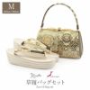 バッグ本体・鼻緒表:絹65% ポリエステル(金銀糸含む)35% バッグ裏地:ナイロン100% 口金:鉄 草履本体:合成皮革 鼻緒裏:ナイロン100% 芯材:コルク 底材:合成皮革