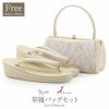 成人式や結婚式での振袖や卒業袴に合わせていただける草履バッグセットです。 わずかな機会でも新品の草履バッグセットですがすがしくお出かけしていただけるよう、お手頃価格でご用意いたしました。 上品なホワイトを基調に、煌めくゴールドで丁寧に織り出された牡丹文様が優雅に広がります。 金糸の輝きが意匠を際立たせ、特別な日の装いを華やかに引き立てます。 ■バッグはコンパクトながら、小ぶりなお財布やスマートフォン・ハンカチや口紅などの手放せない手荷物が入る収納力があり、お祝いの席にもぴったりな洗練されたデザイン。 口金タイプで開閉しやすく、実用性にも優れています。 ■草履は艶を抑えた上品なシャンパンゴールドの草履台にバッグと共布の鼻緒を添え、上品で統一感のあるコーディネートを演出。 2枚芯の程よい高さで安定感もあり、クッション性のある柔らかな履き心地で長時間のご着用も安心です。 華やかな装いを楽しみたい日のおともに、ぜひお手に取っていただきたい草履バッグセットです。