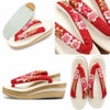 鮮やかな赤と白の生地のバッグには桜と藤の刺繍が施され、振袖姿に相応しい可愛さと華やかさのあるデザインです。 バッグは、2通りのパターンでご利用いただけます。 (1)チェーンをバックの中に入れて、クラッチバックとしてお使いいただけます。 (2)チェーンを出して、ハンドバックとしてお使いいただけます。 携帯電話やお財布など、必要なものが入る程良い大きさです。 草履の花緒にも桜と藤の刺繍が施され、バッグと同じデザインが統一感をプラス。 草履台はかかとの高さは約6cmと程良いヒール高。 歩きやすくとても履き心地がいい逸品です。 成人式や卒業式、謝恩会といった振袖スタイルに最適な、振袖用草履バッグセットです。