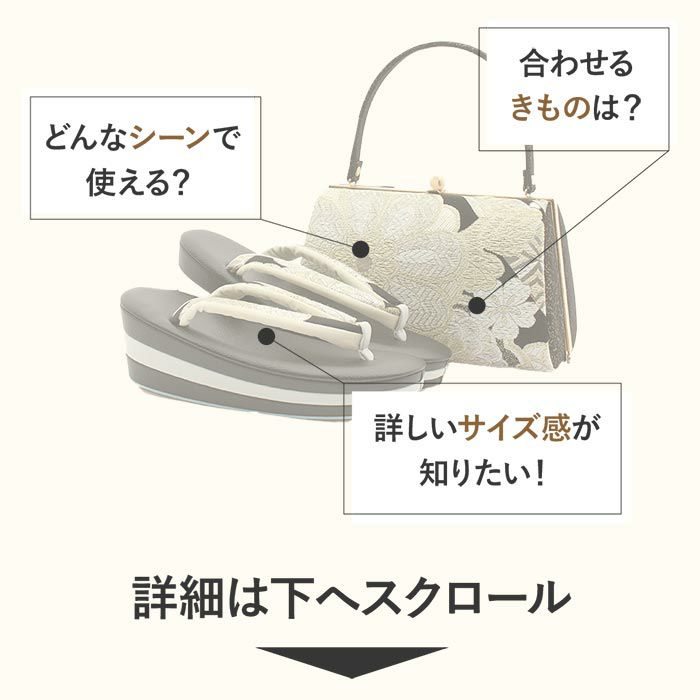 バッグ・花緒:ブラック、ライトゴールド 、シルバー、ホワイト(エメラルドグリーンラメ) 草履台:ブラック、ライトグレー