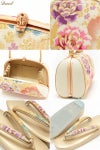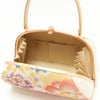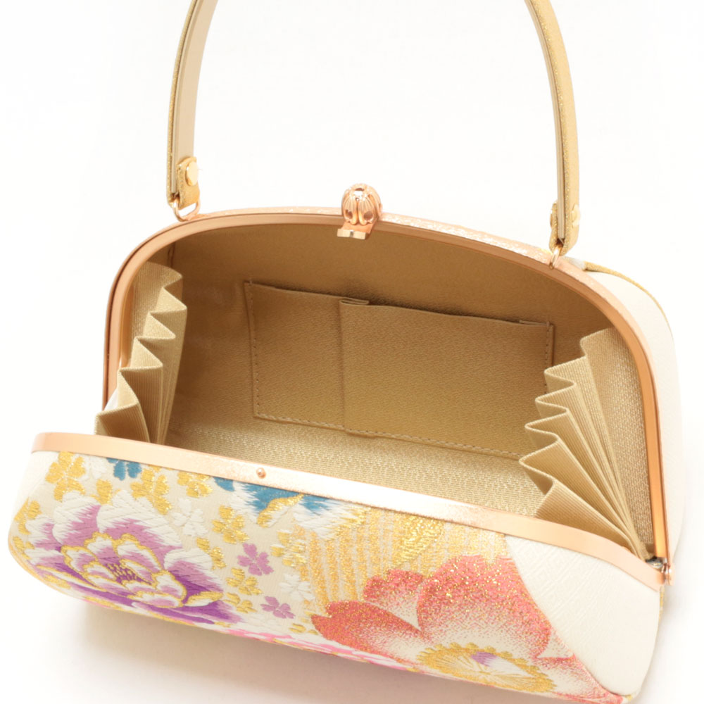 柔らかなクリーム系をベースにしたバッグ生地と花緒には、金糸をふんだんに使用して牡丹や桜などが織り込まれ、彩り豊かで高級感があり振袖スタイルに相応しい華やかさをもつ逸品です。