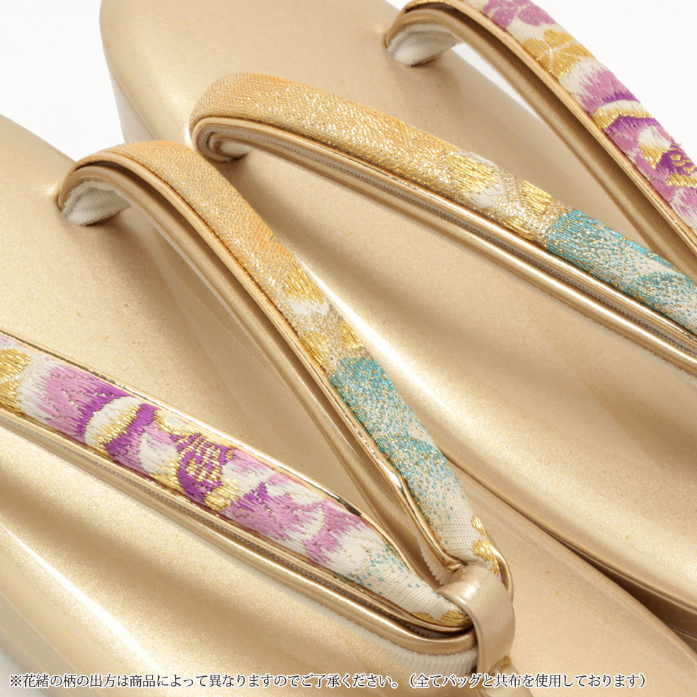 ※草履の花緒はバッグと同じ正絹帯地を使用しておりますが、生地の取り方によって異なります。