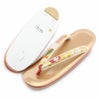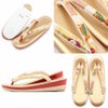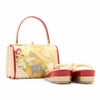 正絹帯地を使用した振袖用草履バッグセットです。 バッグ生地と花緒には、金糸をふんだんに使用して華紋などが織り込まれており、振袖スタイルに相応しい豪華で華やかさのあるデザインです。 バッグと同じデザインの草履の花緒が統一感をプラスし、お着物姿をより一層華やかに演出します。 柔らかなクッション加工が施された履きやすさ抜群の逸品。 足裏にあたる部分はなだらかな曲線で歩きやすく、初心者の方にも安心の履き心地です。 かかとの高さが約5.5cmと程良いヒール高の2枚芯。草履の天部分(表面)はソフトな足触りで柔らかなクッション加工になっており、衝撃にも強く長時間の歩行も疲れを感じさせない逸品です。 バッグは一本手で持ちやすく、袱紗やお財布、スマートフォンなどがしっかりと入る大きさ。 成人式や結婚式の振袖をはじめ、謝恩会や卒業式など晴着スタイルにご利用いただける振袖用草履バッグセットです。