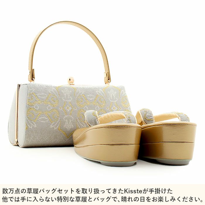 鼻緒にはバッグと同じ生地が使われており、上品な輝きとコーディネート全体の統一感を演出します。