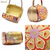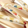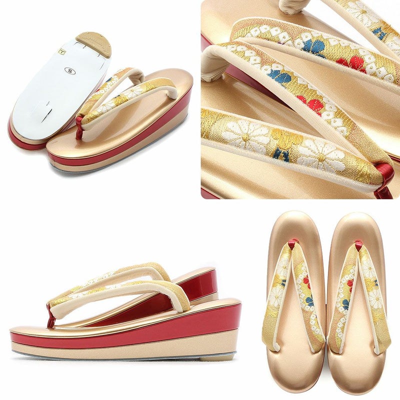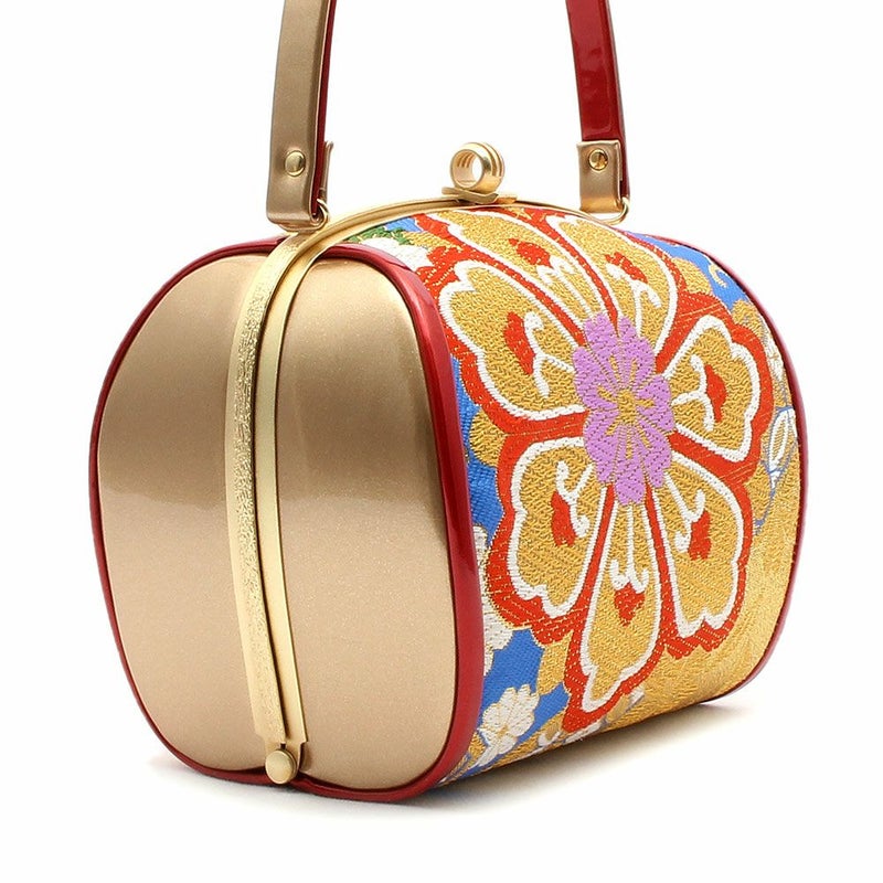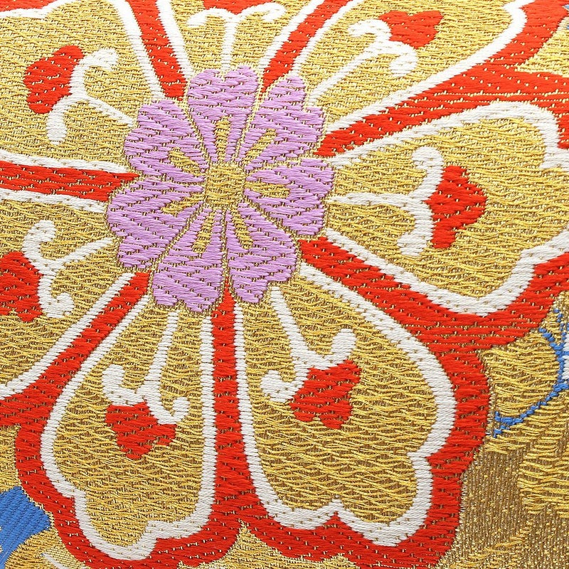 帯地を使用した振袖用草履バッグセットです。 バッグ生地と花緒には上質な金糸が織り込まれ、成人式や卒業式などに相応しい華やかで高級感あるデザイン。 バッグと同じデザインの草履の花緒が統一感をプラスしています。 青地をベースに、金糸で華紋に菱が織り込まれている高級感あふれるデザイン。 2色使いのバイカラーで華やかな雰囲気をもつ草履は、かかとの高さが約6.0cmのヒール高で、クッション加工が施されており、 歩きやすく一層お着物姿を美しく演出します。 バッグの容量は、お財布や携帯電話などが入る程良い大きさ。 成人式や結婚式の振袖をはじめ、謝恩会や卒業式など晴着スタイルにご利用いただけます。