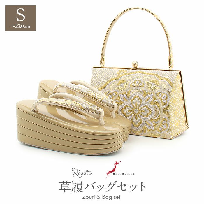 帯地の華やかな色合いが、特別な日をより一層輝かせる、振袖用の草履とバッグのセットをご紹介します。 バッグ生地と花緒には、金糸をふんだんに使用した、振袖スタイルに相応しい豪華で華やかさのあるデザインです。 バッグと同じデザインの草履の花緒が統一感をプラスし、お着物姿をより一層華やかに。 艶やかで光沢のあるエナメルの草履台は4枚芯のハイヒール仕様。 柔らかなクッション加工が施された履きやすさ抜群の逸品です。 かかとの高さは約8.0cmのヒール高で、小柄なお嬢様はもちろん、身長の高いお嬢様の着姿をも美しく魅せ、歩きやすく足への負担を軽減します。 バッグの容量は、お財布やスマホなどが入る程良い大きさ。 開きも大きく 小物の出し入れがスムーズに出来ます。 他の人とは違うオシャレにこだわりたい、そんなお洒落女子におススメする、ワンランク上の草履バッグセット。 成人式の振袖を始め、卒業式の袴や結婚式のお呼ばれなど華やかな着姿にご利用いただけます。 着姿をスタイルよく魅せてくれる美しい「日本製」の振袖用草履バッグセットを、大切なハレの日にぜひご活用下さい。