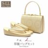 ◆東京・浅草製の伝統と格調を誇る【紗織】ブランド◆ 結婚式の黒留袖や色留袖、訪問着などのフォーマルなおきものの装いに合わせていただける、 履きものどころ・浅草の有名草履バッグセットブランドの「紗織」が手掛ける礼装用草履バッグセットです。 職人がこだわって作った草履は、履きやすさを重視し、クッション性に優れ、長時間の歩行でも足の疲れを軽減します。 バッグは、小ぶりなお財布やスマートフォン、ハンカチや口紅などの手放せない手荷物が入る容量。 繊維1本1本に抗菌効果 防臭効果もあるパールトーン加工(撥水加工)を施し、風合いや光沢、美しさを保ち長くご愛用いただけます。 また、底鋲もついて、畳や机に置くときにバッグ本体を擦ってしまうのを防ぐことができます。 式場などでは貸し出しの草履バッグセットもありますが、やはりおめでたい席や礼装の場面で真新しい綺麗な草履バッグセットを身につけていることでいい気分で過ごせます。 フォーマルな装いを楽しみたい日のおともに、ぜひお手に取っていただきたい「紗織」ブランドの草履バッグセットです。