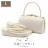 結婚式の黒留袖や色留袖、訪問着などのフォーマルなおきものの装いに合わせていただける草履バッグセットです。 履きものどころ・浅草の有名草履バッグセットブランドの「紗織」が手掛ける 礼装用草履バッグセットです。 職人がこだわって作った草履は、履きやすさを重視し、クッション性に優れ、長時間の歩行でも足の疲れを軽減します。 バッグは、小ぶりなお財布やスマートフォン、ハンカチや口紅などの手放せない手荷物が入る容量。 繊維1本1本に抗菌効果 防臭効果もあるパールトーン加工(撥水加工)を施し、風合いや光沢、美しさを保ち長くご愛用いただけます。 また、底鋲もついて、畳や机に置くときにバッグ本体を擦ってしまうのを防ぐことができます。 式場などでは貸し出しの草履バッグセットもありますが、やはりおめでたい席や礼装の場面で真新しい綺麗な草履バッグセットを身につけていることでいい気分で過ごせます。 フォーマルな装いを楽しみたい日のおともに、ぜひお手に取っていただきたい草履バッグセットです。
