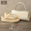 ■浅草の職人技が光る〈浅草・匠〉ブランドの草履バッグセット■ バッグと鼻緒に西陣織の正絹生地を贅沢に使用し、吉祥文様の「雲取り柄」を織り上げました。 格調高い意匠が、礼装の装いをより一層華やかに引き立てます。 バッグは両端にスリットポケットを備え、すぐに取り出したい小物を収納するのに便利。 中央部分は金具付きで大きく開くため、荷物の出し入れがスムーズに行えます。 底鋲があるので、置いたときも底が傷みにくく安心。 美しい佇まいと実用性を兼ね備えたデザインです。 草履はふっくらとした鼻緒が足にやさしく馴染み、足裏に当たる部分にはクッション加工を施しています。 格式ある3枚芯で程よい高さを持たせ、ゴールドのラインが華やぎを添えます。 フォーマルシーンを一層華やかに引き立て、快適さも兼ね備えた草履バッグセット。 大切な日のおともに、ぜひお手に取っていただきたい逸品です。