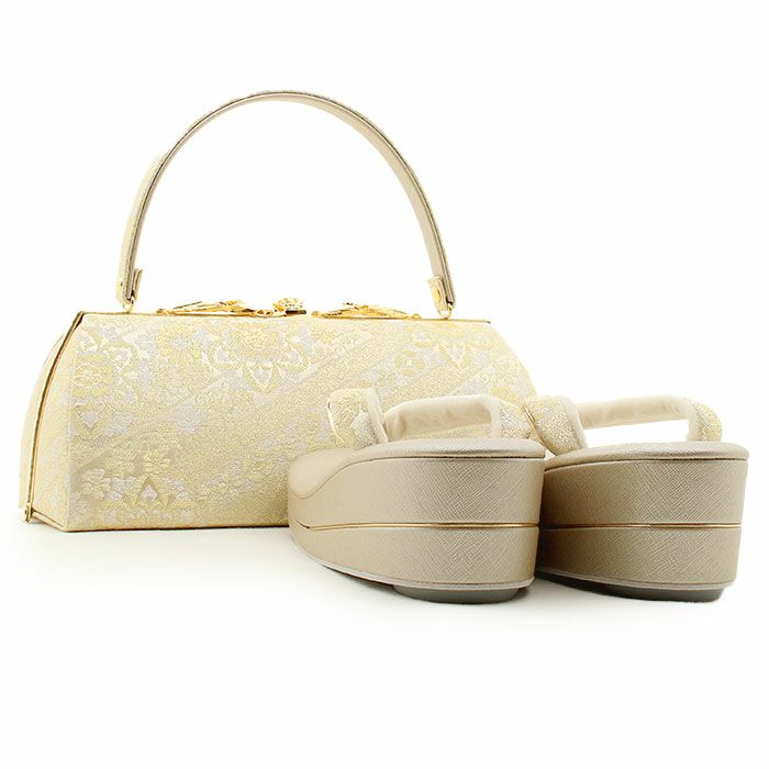 痛くなくて歩きやすい4枚芯の華やかな高さ 留袖用草履バッグセット 訪問着用 彩小径 フリー Lサイズ ゴールド クリームシルバー シャンパンゴールド 花菱 正絹袋帯地 凛華錦 4枚芯 日本製
