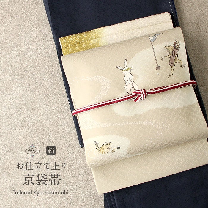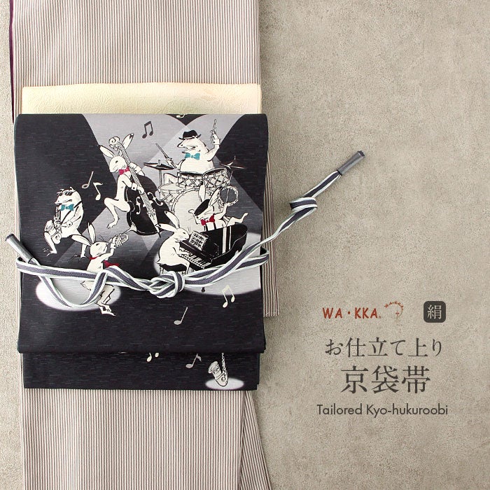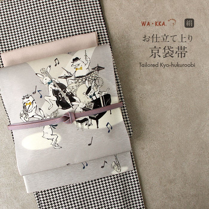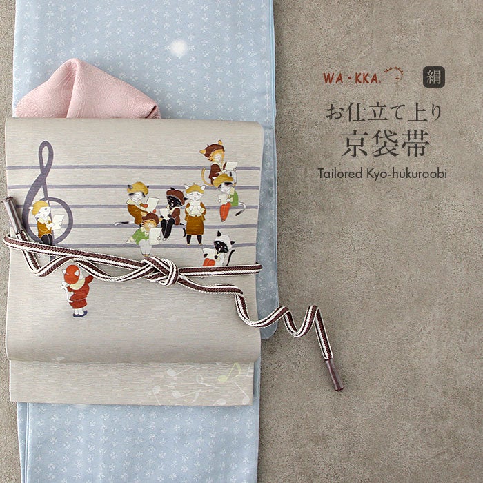 【最短日お届け】≪WA・KKA≫小紋・紬・色無地などカジュアルな着物に 京袋帯 正絹 グレージュ Let’s Sing 猫 WAKKA 仕立て上がり おび なごや帯 名古屋帯 カジュアル おしゃれ 普段用 未使用 新品 春 秋 冬
