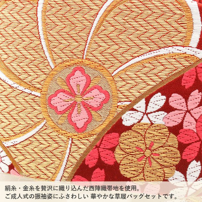 草履バッグセット 成人式 振袖用 フリーサイズ Lサイズ 日本製 帯地 <レッド/紗綾型に菊など> SoNaTa