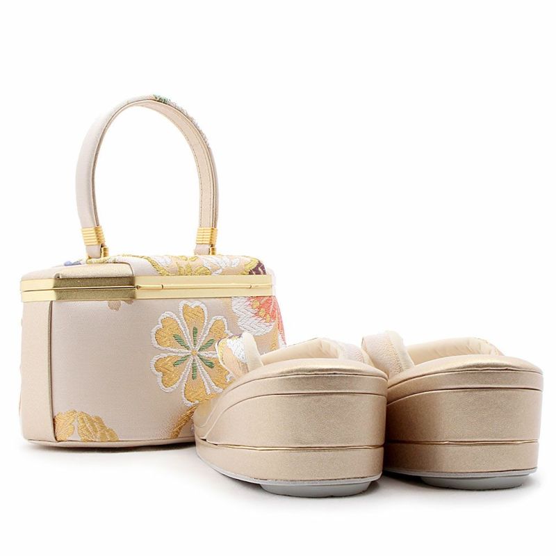 草履バッグ セット 成人式 振袖用 留袖用 訪問着用 <紗織> Sサイズ Mサイズ Lサイズ LLサイズ 日本製 <クリームゴールド・シルバー/桜花丸刺繍>