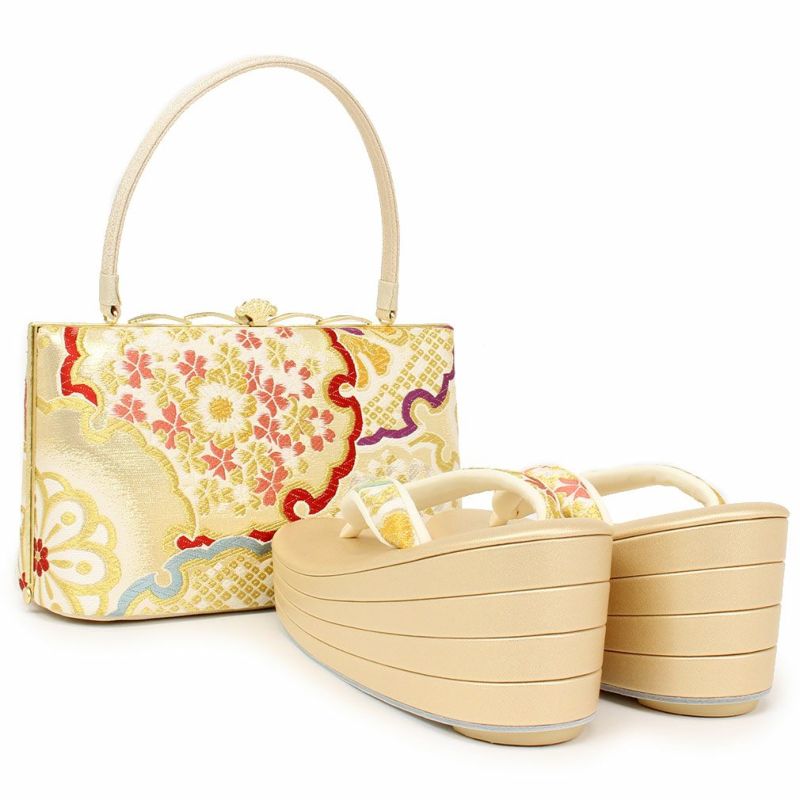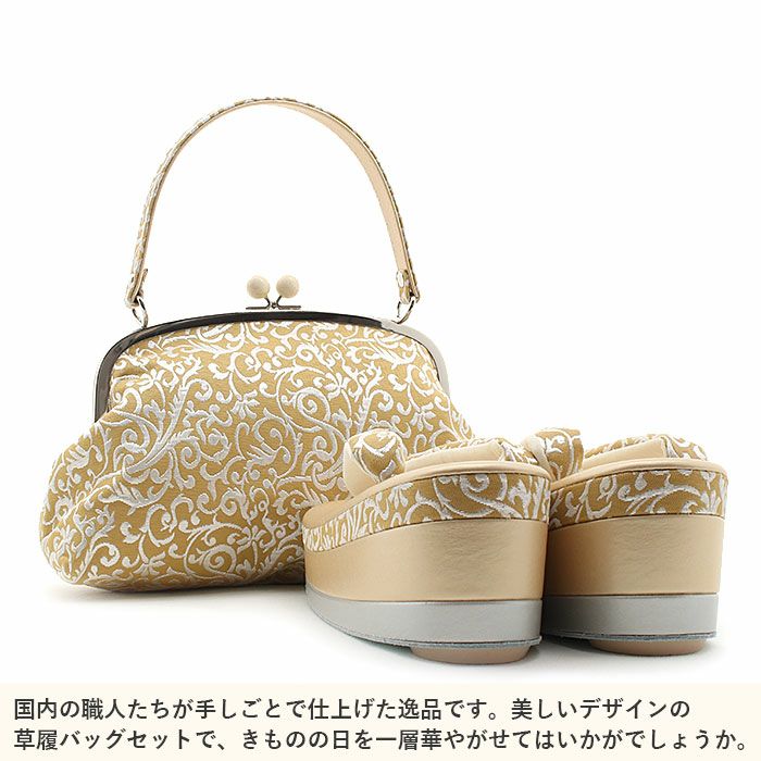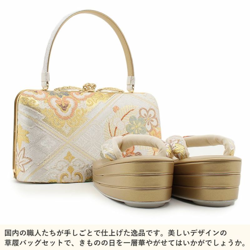 痛くなく歩きやすい、初めての方にも安心の履き心地 草履バッグセット 留袖用 訪問着用 草履バッグ 浅草 匠 S M L LL ゴールド 金 雲取り 花 西陣織 正絹 帯地 3枚芯 日本製