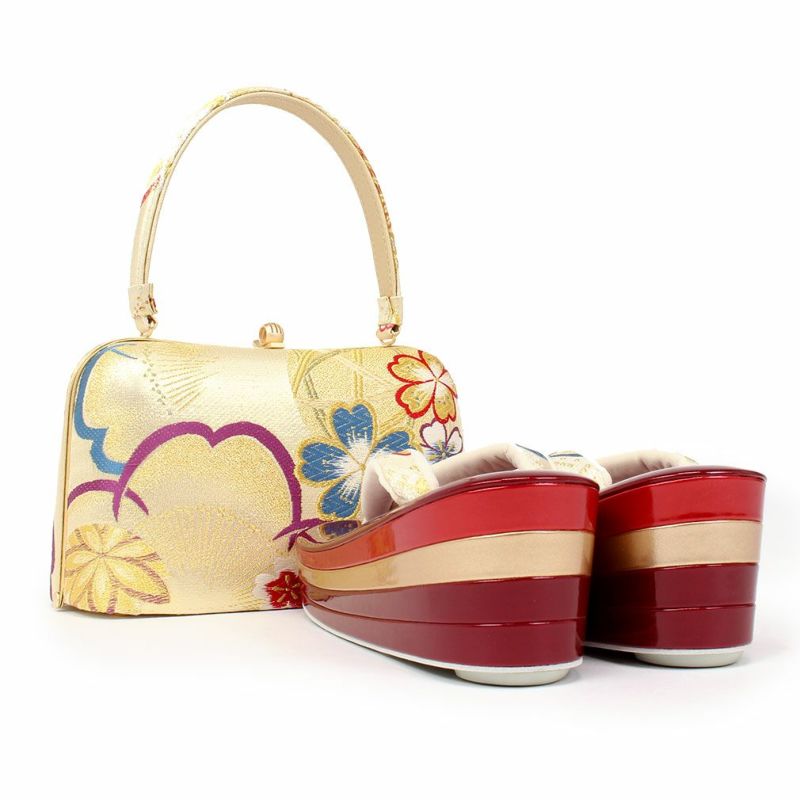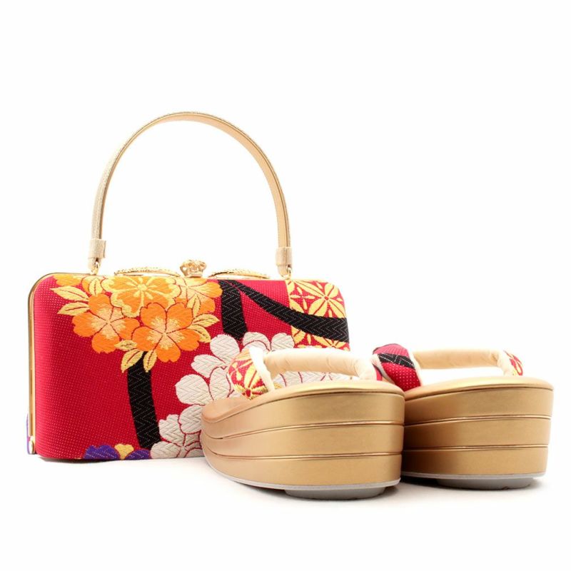 草履バックセット 振袖用 草履 厚底 Sサイズ 赤 青 ゴールド 椿 梅 帯地 エナメル 日本製