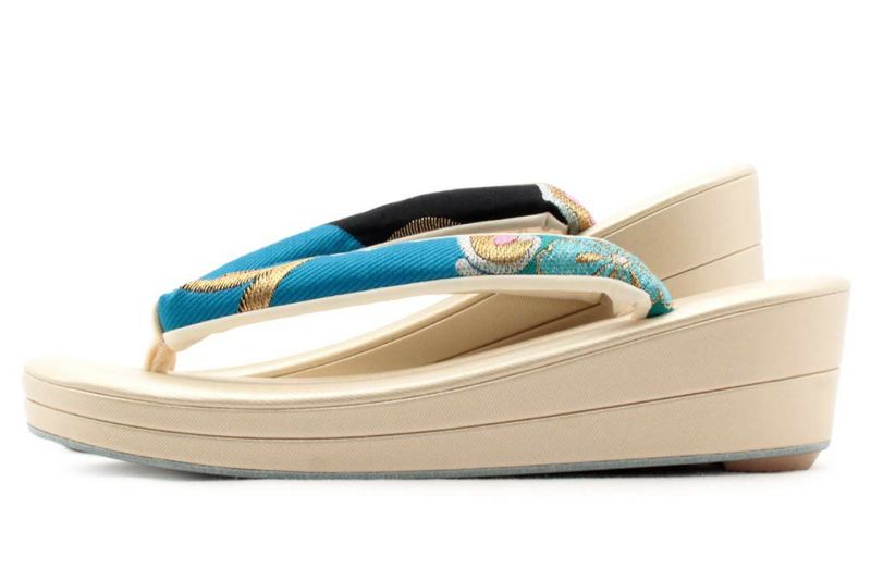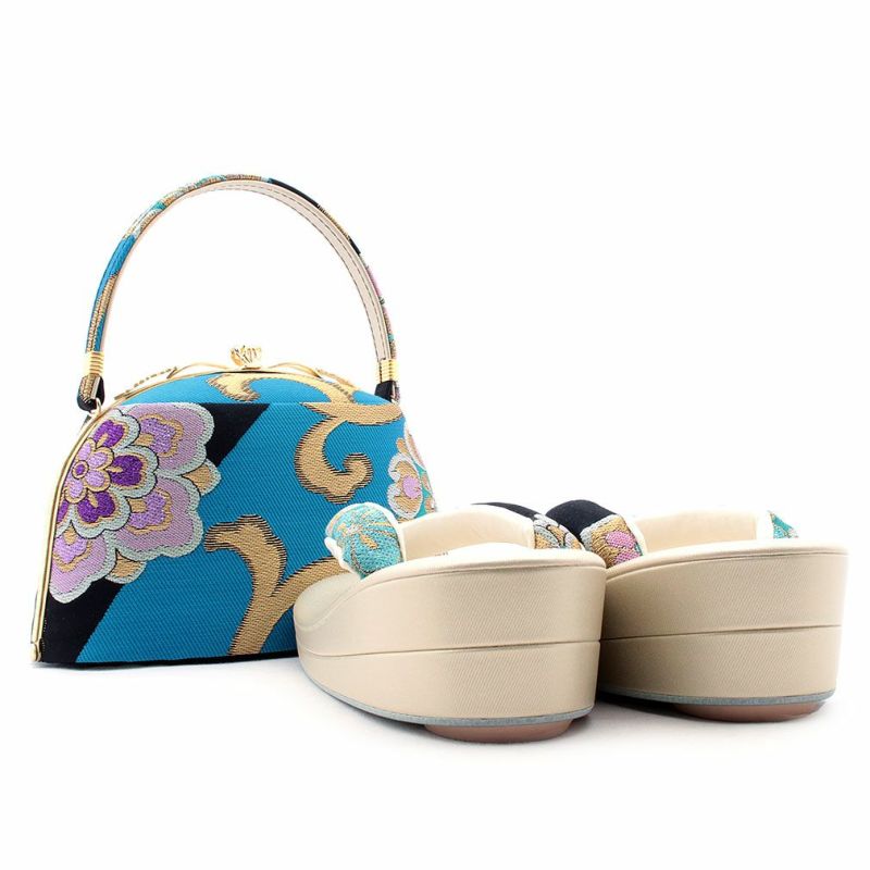 草履バッグセット 成人式 振袖用 <世美庵> Lサイズ フリーサイズ 日本製 正絹袋帯地 ハイヒール <ブルー/八重桜に鹿の子>