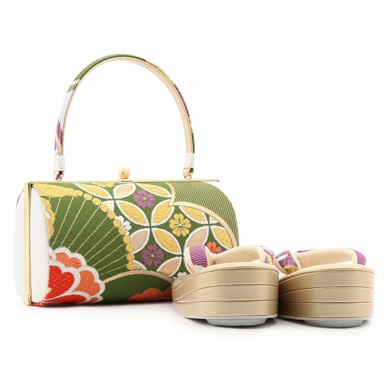 成人式や結婚式の華やかな振袖にぴったり 草履バッグセット 成人式 振袖用 キステオリジナル Sサイズ Mサイズ Lサイズ LLサイズ 金 緑 華紋 帯地 4枚芯 ハイヒール 厚底