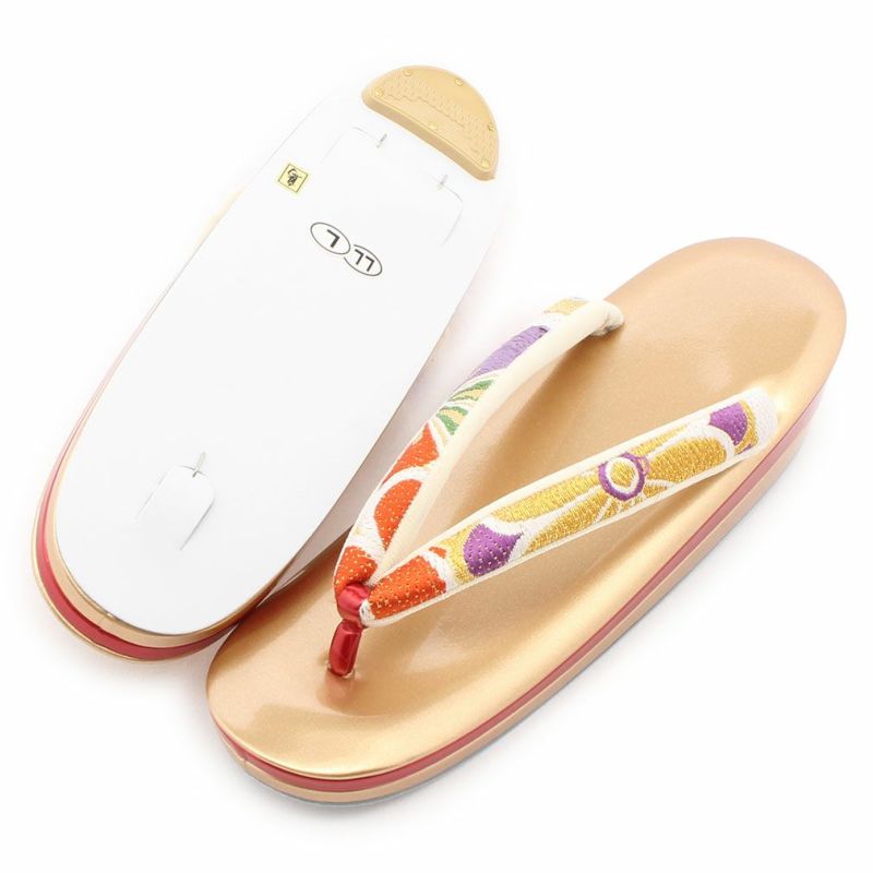 痛くなく歩きやすい、初めての方にも安心の履き心地 振袖 草履バッグセット 成人式 草履バッグセット 振袖用 紗織 LLサイズ 大きい 金 西陣織 正絹帯地 花七宝 2の3枚芯 日本製 パールトーン加工
