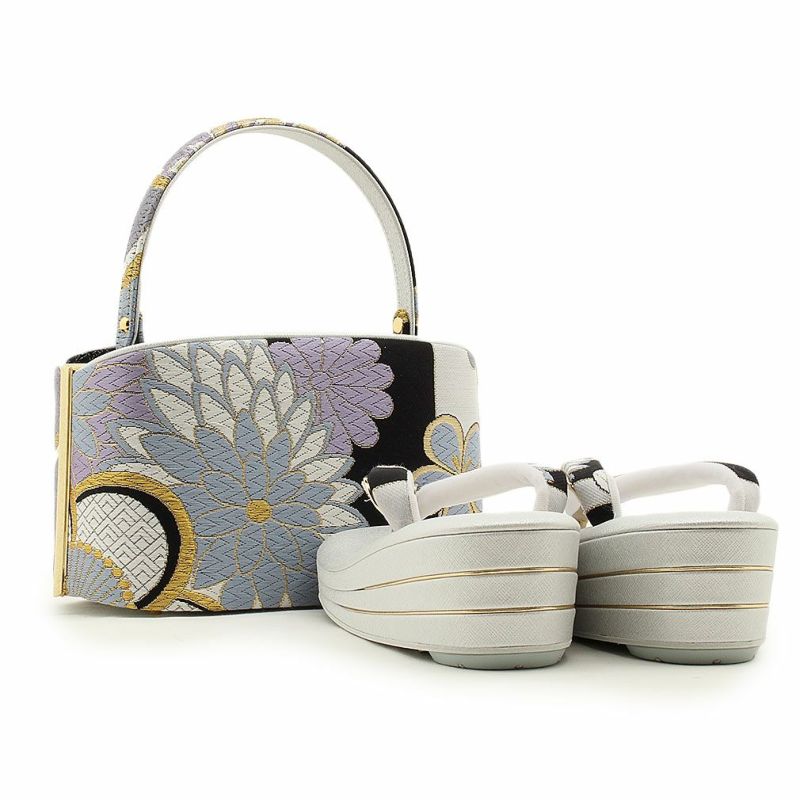 留袖用草履バッグセット 訪問着用 フリーサイズ Lサイズ 日本製 京都西陣 <シルバー/立涌に菊>